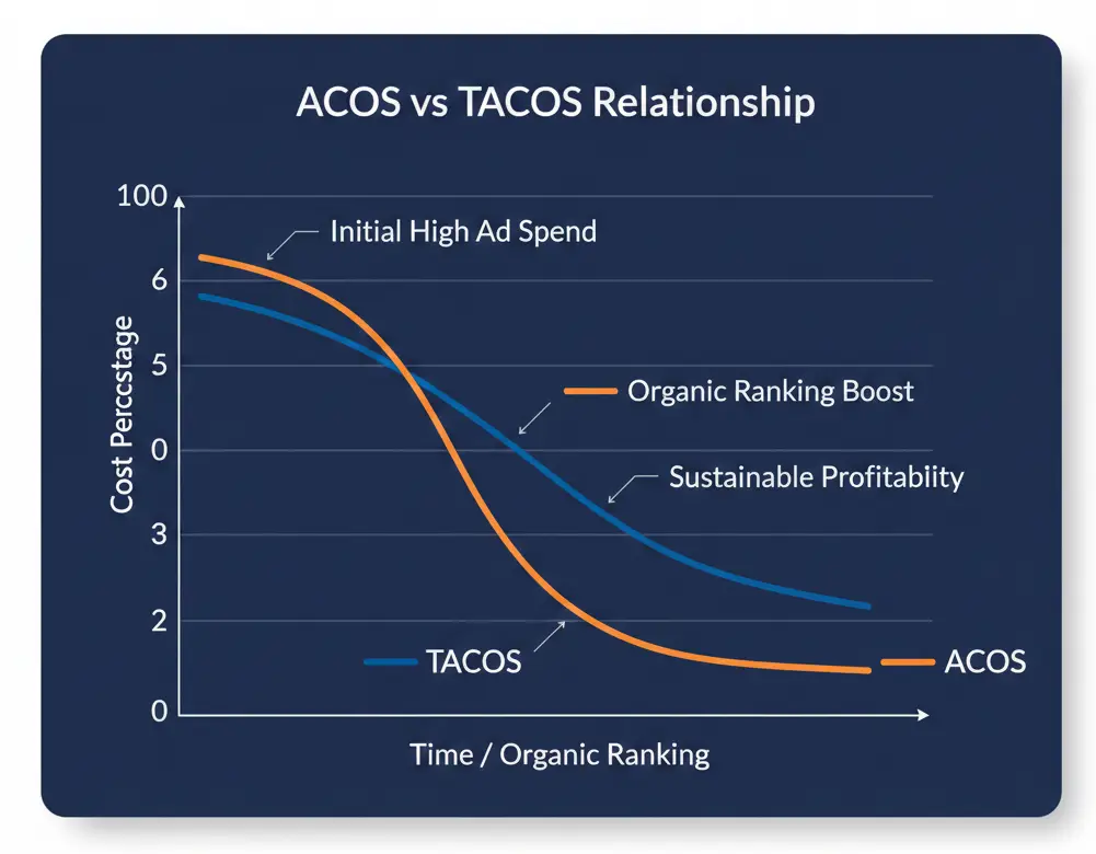 PPC Boosts Organic Sales (TACoS concept): Beyond just the immediate ad sales, sellers see PPC as a way to drive organic growth. A metric called TACoS (Total Advertising Cost of Sales) looks at your ad spend as a percentage of total revenue (ad sales + organic sales). Many savvy sellers focus on TACoS because a healthy Amazon business leverages ads to spur overall sales, not just direct paid sales. For example, running PPC might lead to higher organic rankings, which then generate more organic (non-paid) sales. If your PPC spend is, say, 10% of your total sales and your total sales are growing, that’s generally a good sign – it means the ads are helping build your brand and product momentum beyond just the ads themselves. Studies and anecdotal evidence show that products heavily advertised in their launch phase often gain enough sales velocity and reviews to later sustain strong sales with lower ad spend. In short, PPC can have a flywheel effect: initial ad-driven sales -> improves organic rank -> organic sales increase -> need for ads at high spend diminishes for maintenance. This is why many experts say the goal of PPC is to eventually boost organic sales and why a slightly high ACoS early on isn’t necessarily bad if it’s building your rank and review base.